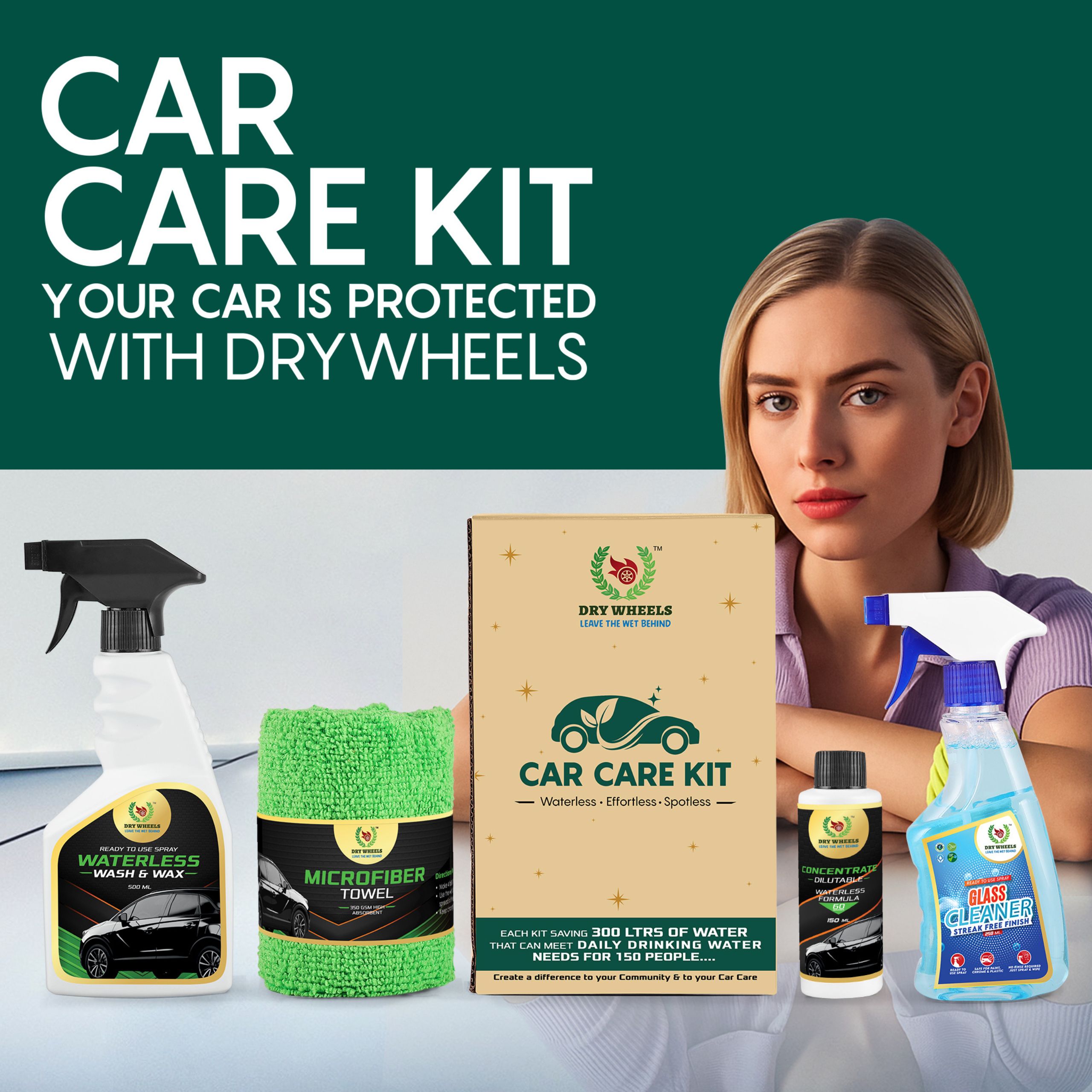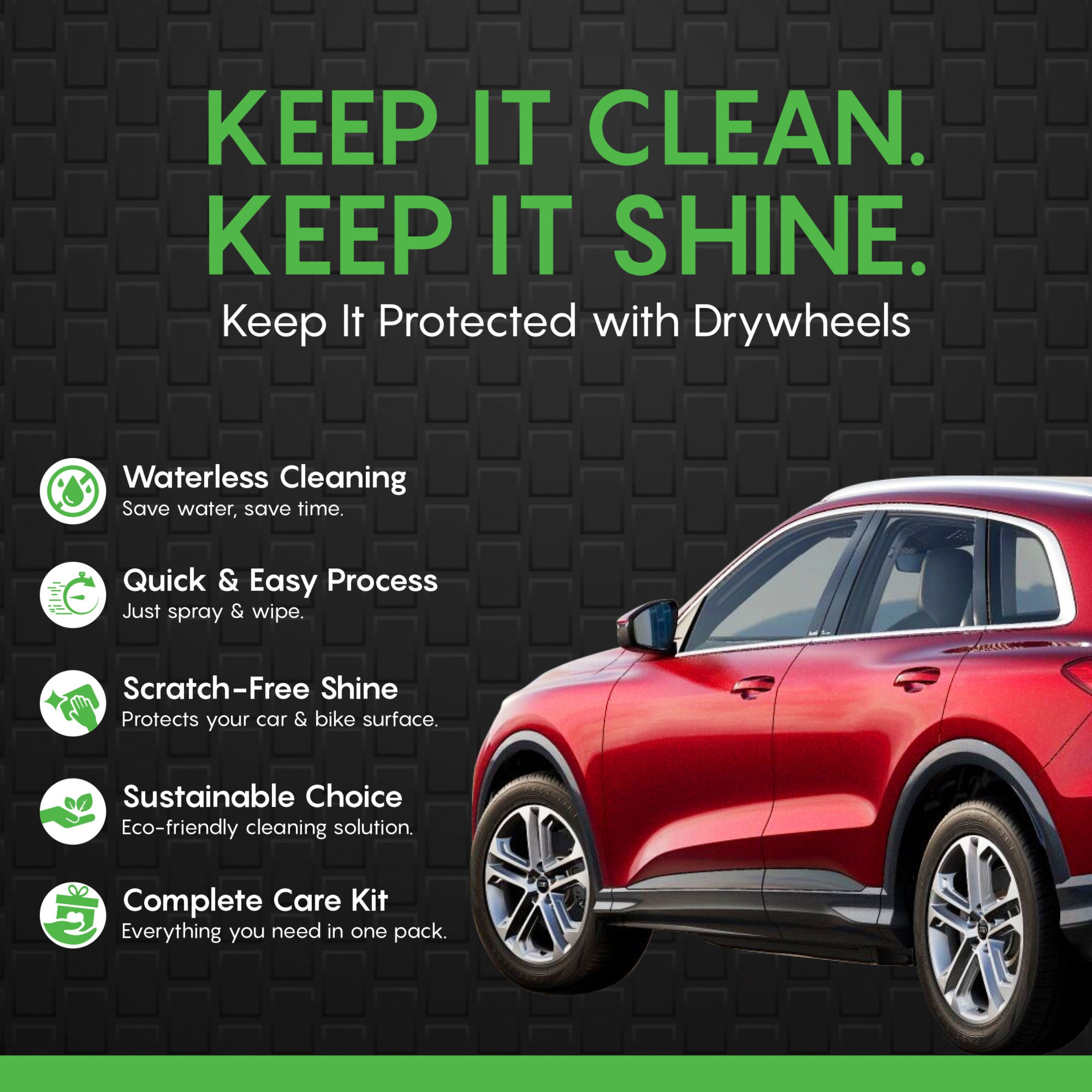 The Dry Wheels Car Care Kit is a comprehensive, water-free solution to keep your car spotless, glossy, and well-protected, without using a drop of water. This kit includes: