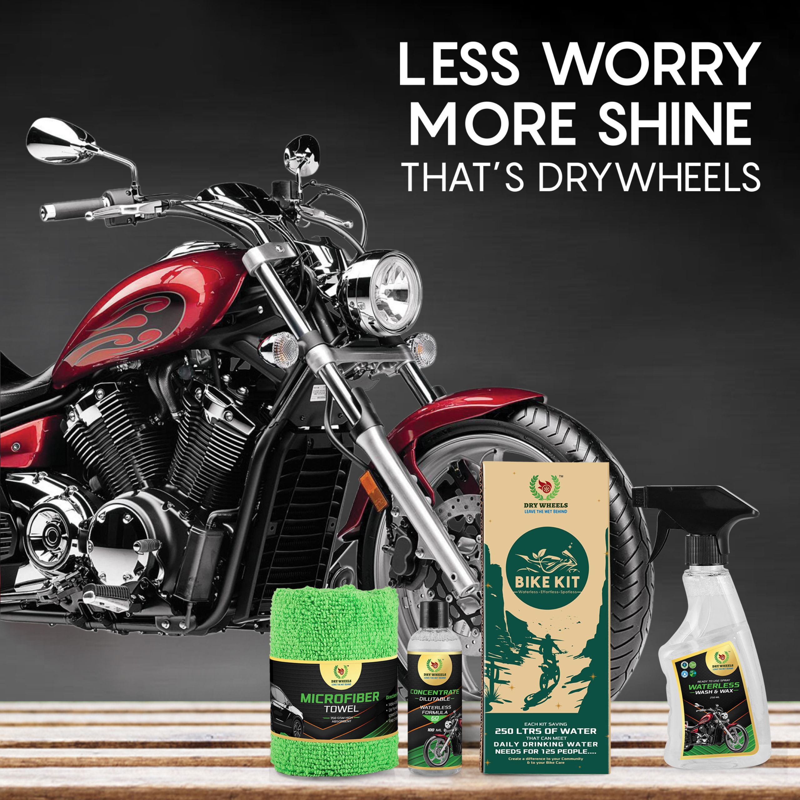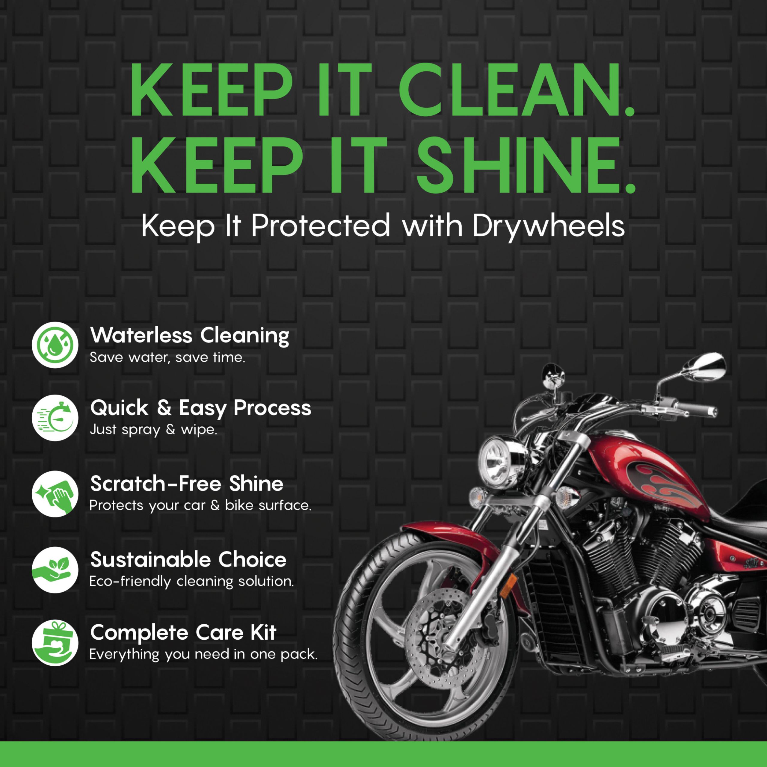 The Dry Wheels Bike Care Kit is your all-in-one solution for keeping your motorcycle spotless and shiny without using water. This kit includes: